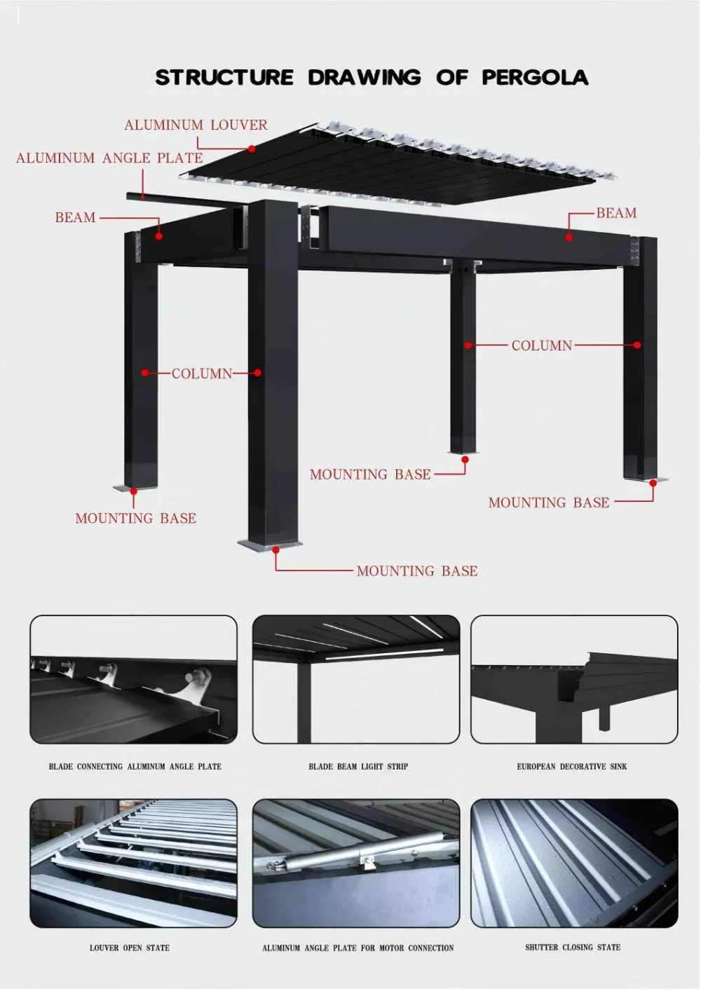 مع 20 عامًا من الخبرة كشركة مصنعة وموردة في الصين، قمنا بتجميع التفاصيل الفنية الأكثر ذكرًا من العملاء العالميين عند شراء Vionta Freestandingبرجولا الومنيوم: